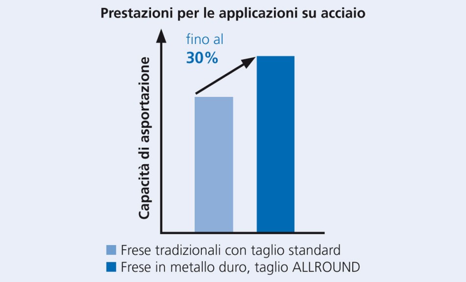 Il taglio ALLROUND dispone di tutti i vantaggi del taglio 3 PLUS, ma vanta una capacità di asportazione aumentata anche del 30% nell'utilizzo sull'acciaio. Grande comfort grazie alla riduzione delle vibrazioni e del rumore. Inoltre sono caratterizzate da un percettibile risparmio di tempo e da un'elevata economicità.