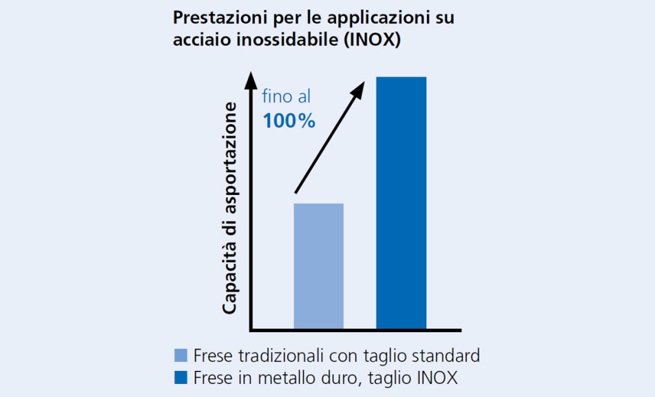Inoltre, rispetto alle frese standard con rompitruciolo, il taglio INOX utilizzato su acciaio inossidabile presenta un tasso di asportazione di materiale superiore del 100% .