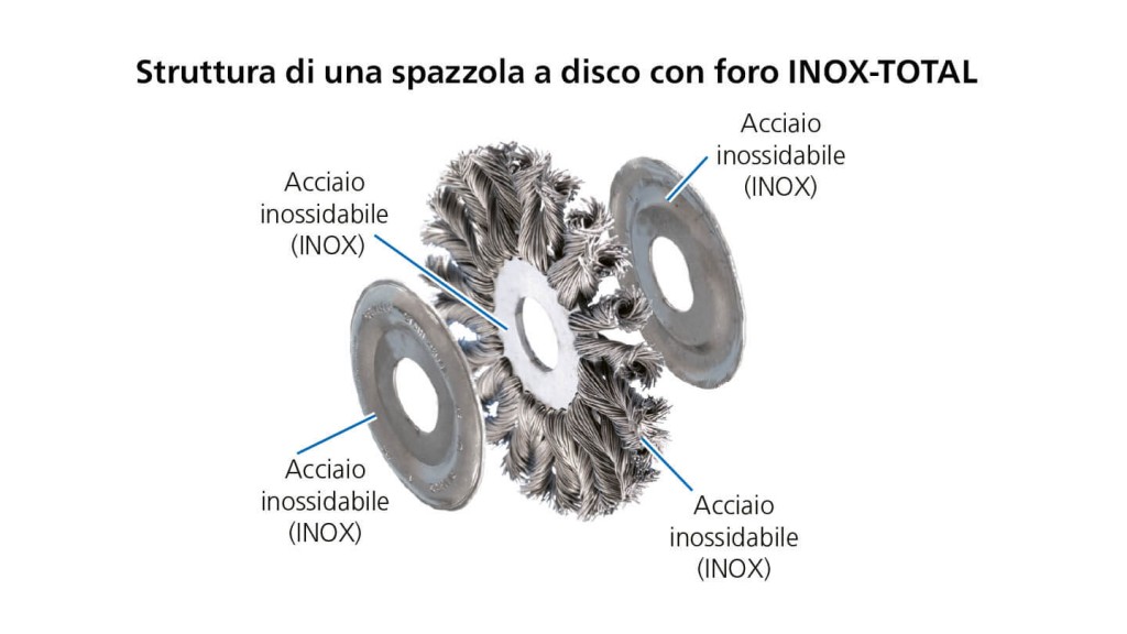 Le spazzole INOX-TOTAL sono ideali per lavori di spazzolatura come la sbavatura, la pulizia e la rimozione di colori di rinvenimento e strati di ossido.