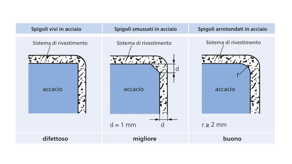 I rivestimenti su spigoli vivi presentano uno spessore inferiore rispetto alle superfici piane. Gli strati protettivi si staccano più frequentemente e inoltre si danneggiano più facilmente.
